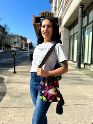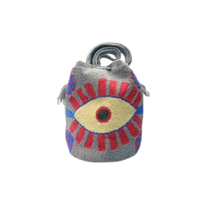 Medium Gray Fucsia eye Tapizada Wayuu Mochila Bag | Lined Punch Needle Crossbody Shoulder Bag | Handmade in Colombia