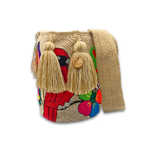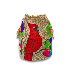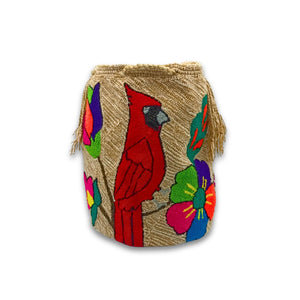 Wayuu Mochila Bag | Large Tapizada | Handmade in Colombia | Red Cardinalis Bird, Beige Base