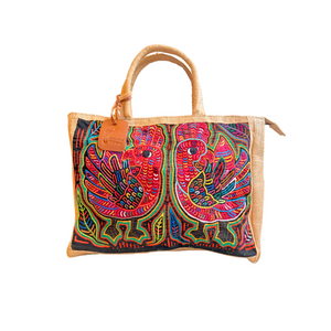 Handmade Burlap Shoulder Tote Bag with Authentic Kuna Mola Design | Rustic Yute | Handcrafted by the Kuna People of Panama | Peacocks