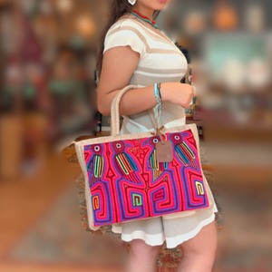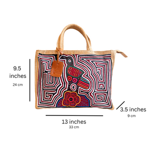 The highlight of this bag is the authentic Kuna mola adorning the front. Molas are a traditional form of textile art created by indigenous Kuna artisans. Each mola is meticulously hand-stitched using layers of fabric to form intricate designs.