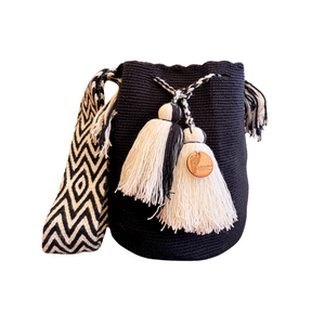 Large Unicolor Wayuu Mochila Bag | Black and White Tassels | Handmade in Colombia