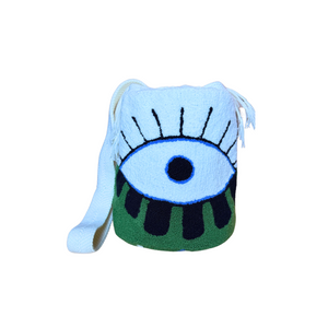 Medium Green blue eye Tapizada Wayuu Mochila Bag | Lined Punch Needle Crossbody Shoulder Bag | Handmade in Colombia