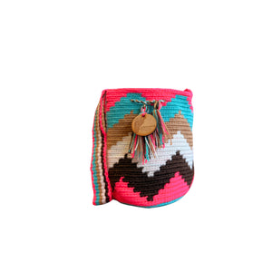 Mini Traditional Wayuu Mochila Bag | Woven Crossbody | Handmade | Pink, Teal and White Zig Zag