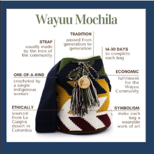 The creation and meaning of each bag have been passed through many generations. The symbolism behind their crocheted patterns and forms along with the intentions of each artisan while marking each bag make these mochilas a wearable work of art and culture. This bag is versatile, fashionable, trendy and great for any occasion.